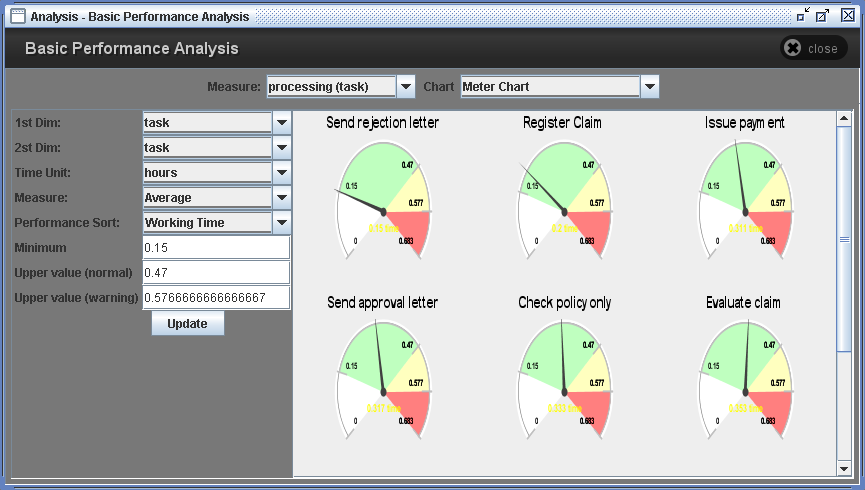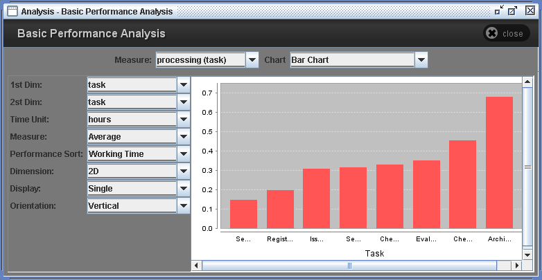 ResultsThe result panel consists of several options and resulting graph. There are two major performance measures. They are measures for tasks (processing) and measures for instance (throughput). And it provides 9 kinds of graphs such as Bar chart, Pie chart, Spider chart, Box-and-Whisker chart, Gantt chart, Time chart, Day-Hour chart, Meter chart, and text view of the result.