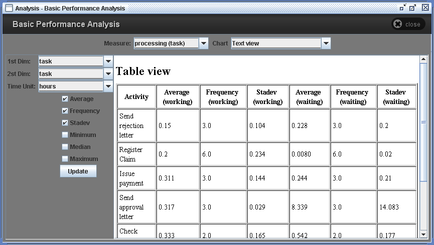 The first three checkboxes allows selecting dimensions for the performance measures for tasks (i.e. execution time, waiting time). User can select task, originator, or instance dimension. For example, if user selects the originator dimension, the execution times can be displayed along with originators. If more than one dimension is selected, the result can be displayed considering two dimensions.