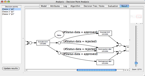 The Result view visualizes the discovered rules (and the selected data attributes) in the context of the process model. Note that the rules discoverd by the Decision Miner can be included in a simulation model of your process. See this page for further information on simulation models in ProM.