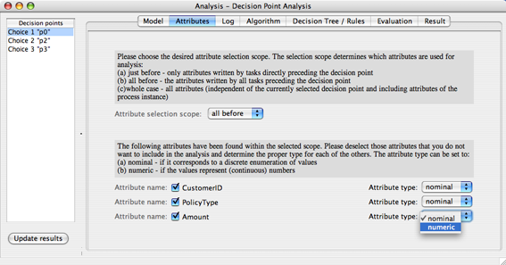 The attributes view allows for the selection of those attributes to be included in the analysis of each decision point. In Figure 5, this view shows all the attributes that are available in the current selection scope for the choice p0. Per default this includes all activities that have been executed before the decision point is reached (with respect to p0 this only includes the task “Register Claim”). However, the scope can be changed in order to include all attributes of the whole case if needed. For the example process, keep the default selection scope and all the attributes included. Furthermore, the type of each attribute can be determined to enable a correct interpretation. Currently, the types nominal and numeric can be distinguished. For the example process, set the type of the Amount attribute to be numeric.