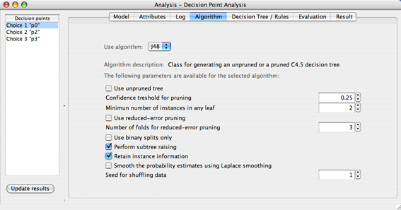 Now we are ready to invoke the analysis. By pressing the button Update results a decision tree is being created for each decision point by the classification algorithm J48. The following section shows how it can be interpreted in order to derive knowledge about what attributes have most likely influenced the corresponding choices.