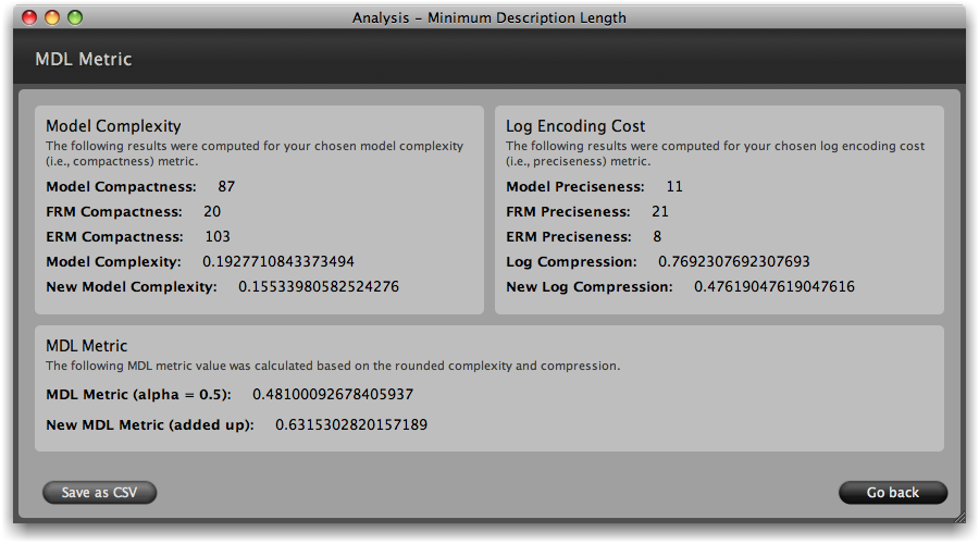 Then, the encoding cost in bits are displayed for the evaluated model and the log compression with respect to the evaluated model. Furthermore, the encoding cost for the reference models are calculated (these reference models are automatically created based on the event log). Finally, the absolute complexity and compression measures and the averaged result (MDL metric) are displayed. The results can be exported as a CSV file.