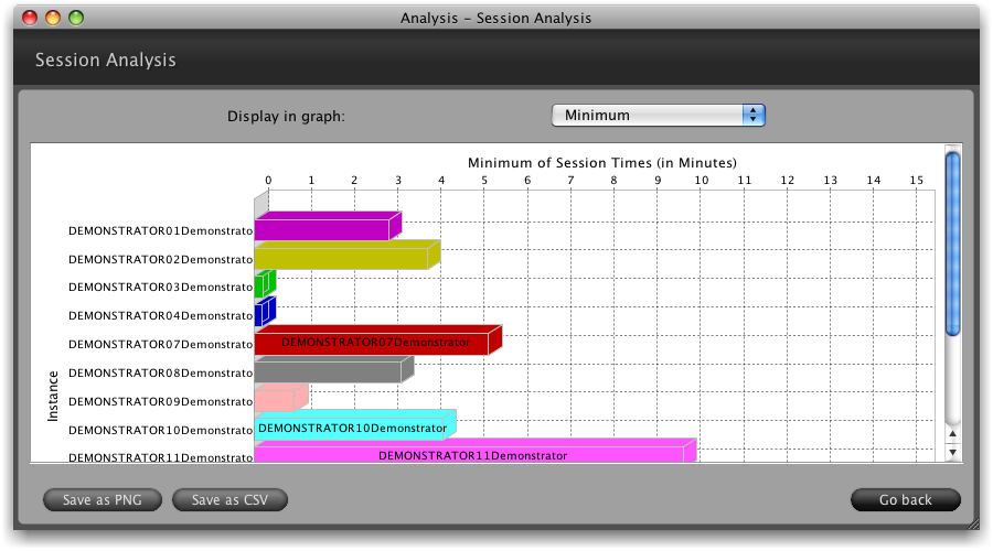 The result screen of the analysis is depicted in Figure 2. Basic statistics (minimum, maximum, sum, arithmetic mean, standard deviation etc.) can be visualized using a bar chart. The current chart view can be saved as a PNG file. Furthermore, these statistics can be exported in a combined way as a CSV file.