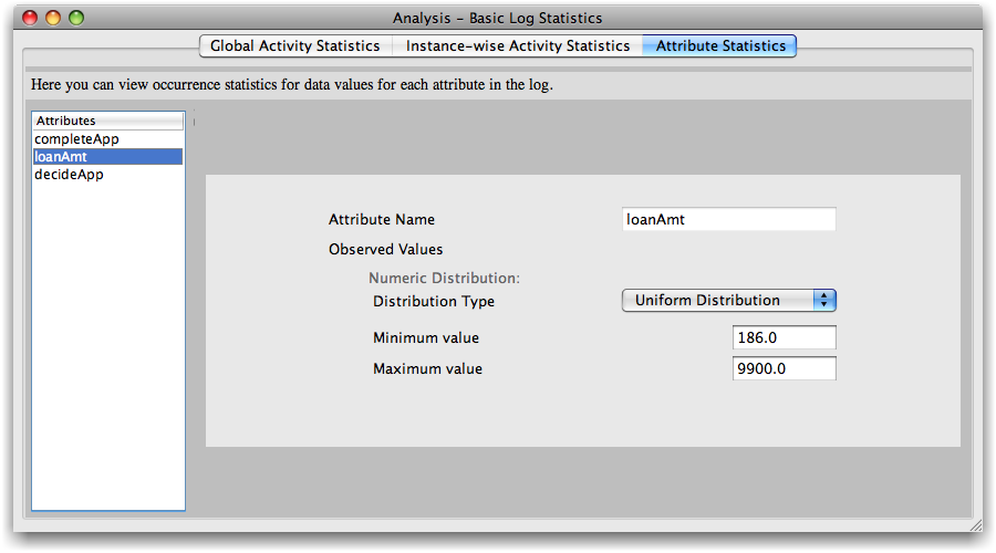 Finally, also the values of data attributes are evaluated, and simple measures such frequencies of nominal values, or minimum and maximum numeric values are calculated. This can be directly useful for generating simulation models that include data. See also Simulation model overview page .