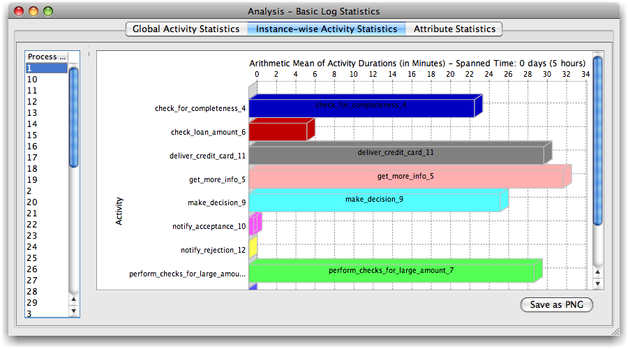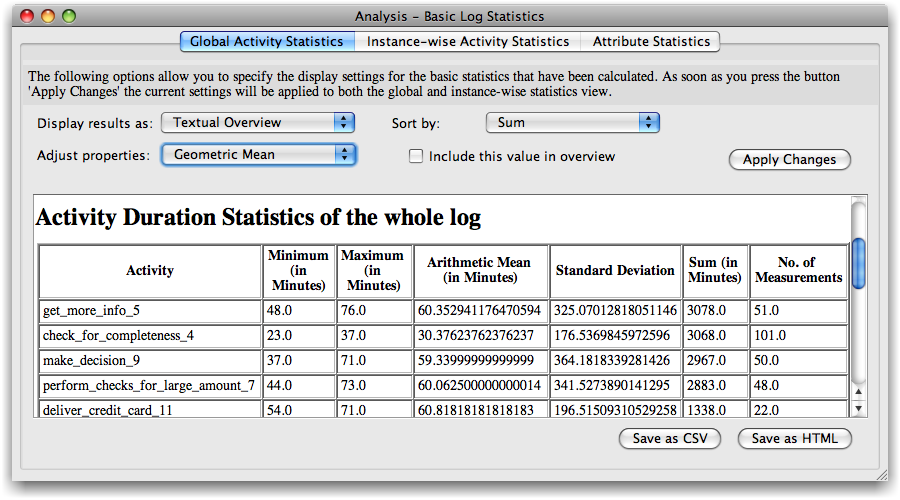 You can view the results for the whole log (Global Activity Statistics) as well for each individual process instance (Instance-wise Activity Statitistics). Note that the settings adjusted in the global view also apply to the instance-based view. Furthermore, you need to press the button “Apply Changes” to actually change the presentation after modifying the settings.