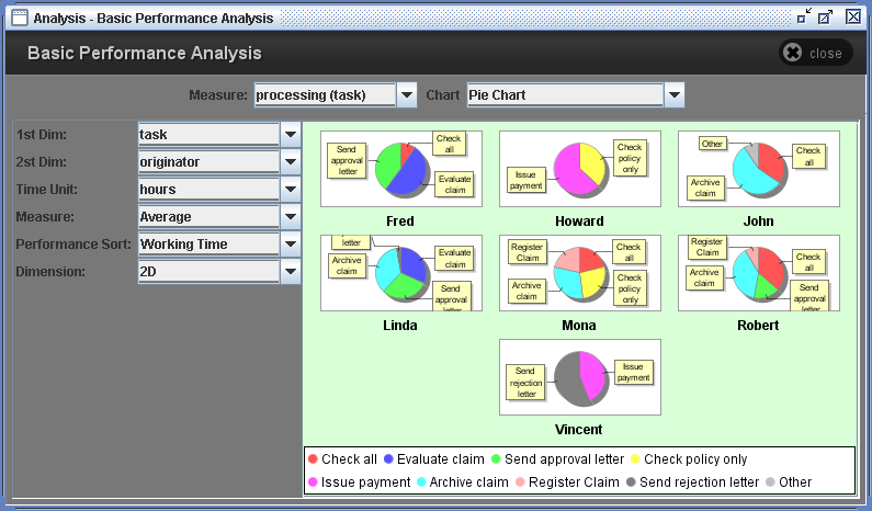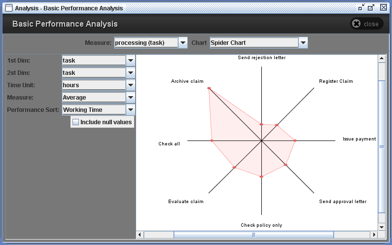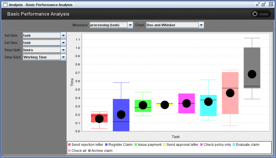 ResultsThe result panel consists of several options and resulting graph. There are two major performance measures. They are measures for tasks (processing) and measures for instance (throughput). And it provides 9 kinds of graphs such as Bar chart, Pie chart, Spider chart, Box-and-Whisker chart, Gantt chart, Time chart, Day-Hour chart, Meter chart, and text view of the result.