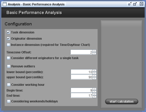 The Basic Performance analysis plug-in consists of two parts. The first part is the configuration of performance measures and the second part is displaying result with several graphs. Figure 1 shows the configuration panel.