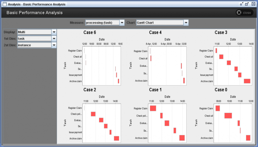 - Display: The overall draws a single chart considering all events in a log. Task, originator, and instance draw several charts for the selected item.