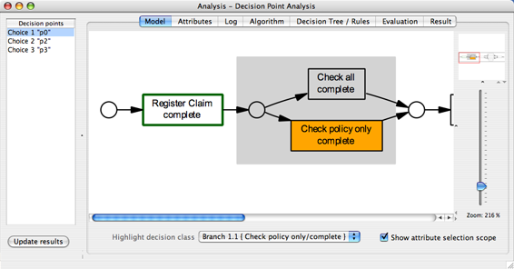 Model ViewThe model view visualizes a choice construct (that is, in Petri net terms a place with more than one outgoing arcs) within the process model. In Figure 3, decision point p0 is depicted in a gray box. In the example process, which represents a simple insurance claim handling process, this choice reflects the decision about whether a full check needs to be performed after the initial registration step, or whether a policy-only check is sufficient for that case. Furthermore, one of the alternative branches has been selected (in the combo box Highlight decision class), which fills the first task in that branch (here “Check policy only”) with orange color. Finally, the Show attribute selection scope option has been chosen, which marks all those tasks with green line color whose attributes are to be considered for the data dependency analysis for this decision point. In the example process only the previous task “Register Claim” is highlighted, and therefore only attributes provided by this task are taken into account for the decision point analysis.