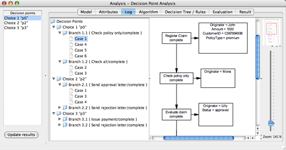 The log view provides a means to manually inspect the process instances categorized with respect to the decisions made at each decision point in the model. In Figure 4, the decision point p0 of the example process is assessed according to the alternative branches “Check all” (which has been followed by two out of six cases) and “Check policy only” (which has been followed by four out of six cases), and process instance Case 2 is currently being displayed in the right-most window. One can observe that during the execution of activity “Register Claim” information about the amount of money involved (Amount), the corresponding customer (CustomerID), and the type of policy (PolicyType) are provided. Semantically, Amount is a numerical attribute, the CustomerID is an attribute which is unique for each customer, and both PolicyType is an enumeration type (being either “normal” or “premium”).