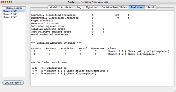 Now we are ready to invoke the analysis. By pressing the button Update results a decision tree is being created for each decision point by the classification algorithm J48. The following section shows how it can be interpreted in order to derive knowledge about what attributes have most likely influenced the corresponding choices.