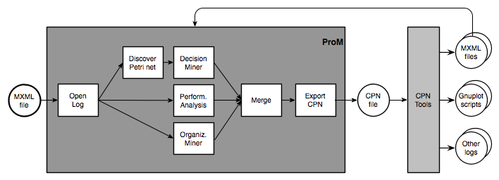 The following overview picture shows the dependencies between the main steps that need to be take to generate a simulation model from an event log only. Several plug-ins are used to obtain simulation-relevant information about data, timing, and resources in the process. Then, these different types of information can be merged and exported as a CPN.