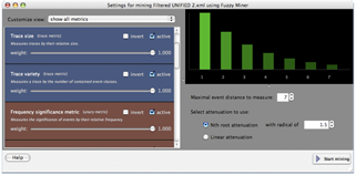 The bottom right area holds the measure point and attenuation settings. The maximal event distance to measure sets the number of measure points, i.e. how far the measurer will “look back” from each event in the log for applying the metrics.