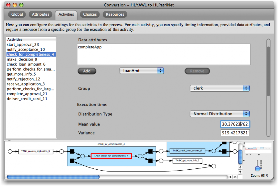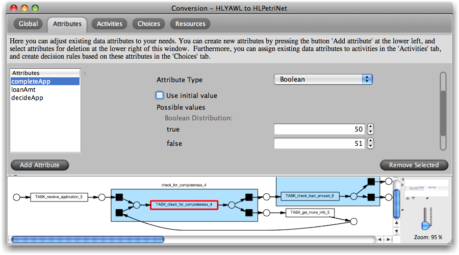- data attributes: Based on logical expressions over data attributes pre-conditions can be formulated (see also Attribute Settings). Currently, these rules can be discovered by the (Decision Miner ) or imported (newYAWL Import) but not yet manually provided. So, the fields cannot be edited.
