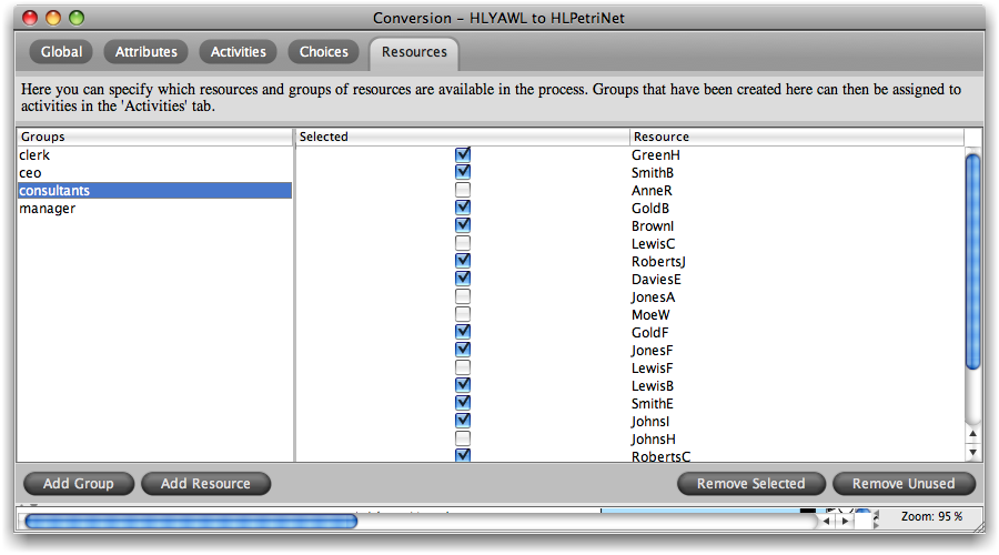 Note that these groups can be used to define required roles for activities (see also Activity Settings), and that unused roles (i.e., groups that are assigned to no activity in the process) can be removed by pressing the button “Remove Unused”.